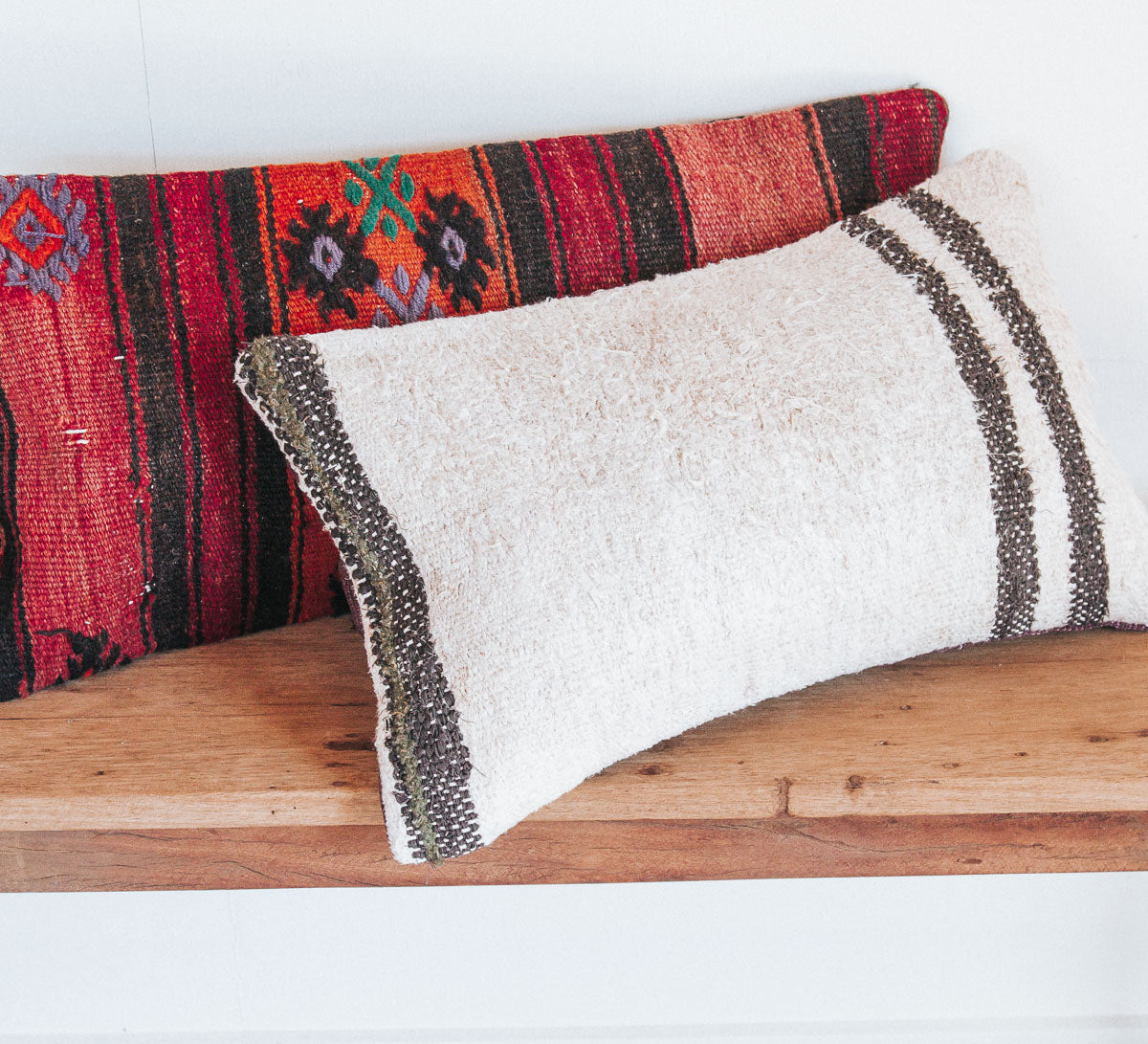 These handmade textural cushions are recycled from vintage Kilim rugs and turned into beautiful cushions perfect for layering.  They look amazing paired up or scattered with sheepskins for the ultimate boho vibe. Each one is unique and one of a kind.