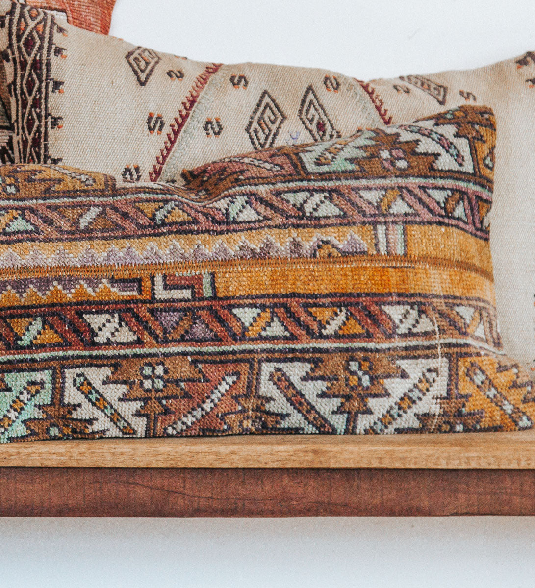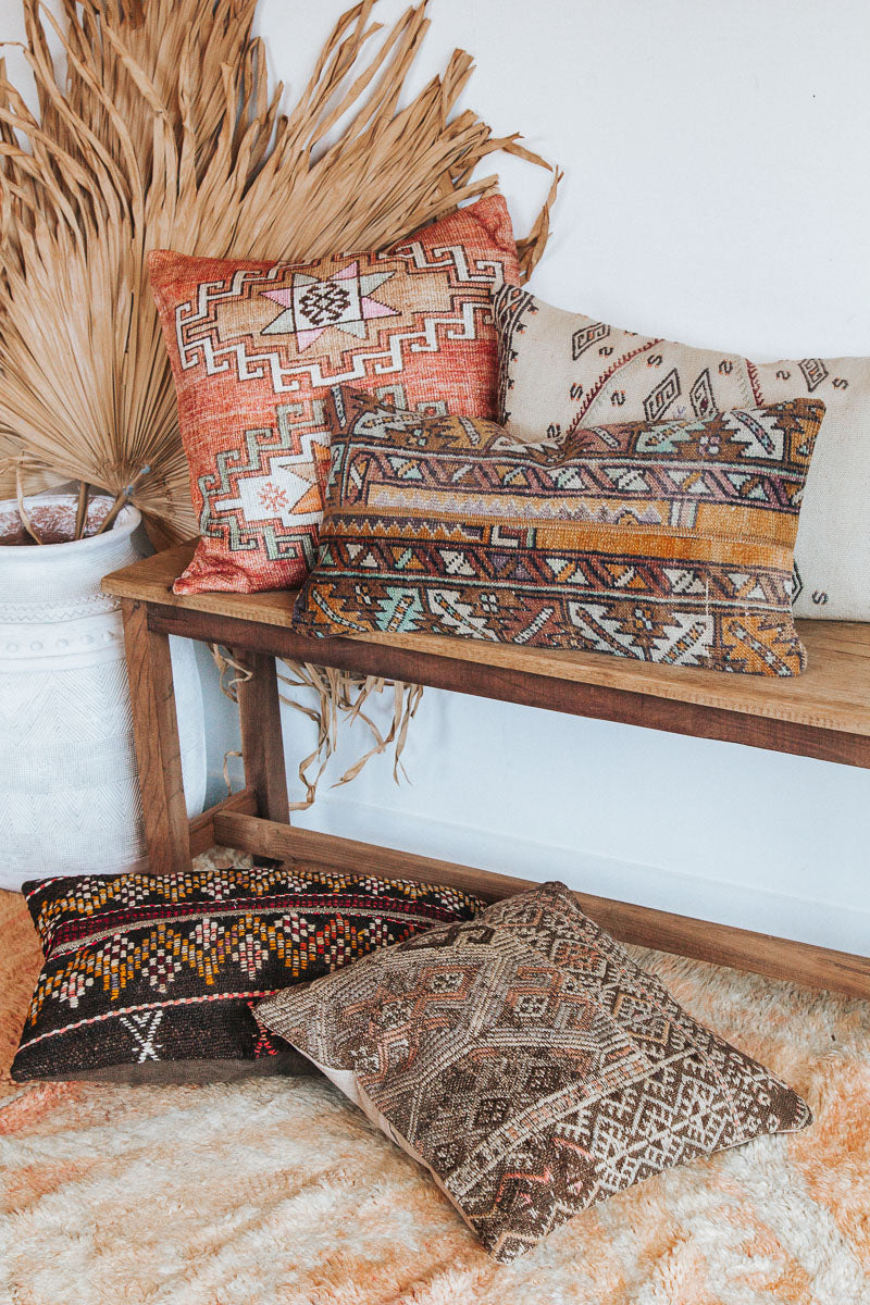 These handmade textural cushions are recycled from vintage wool Kilim rugs and turned into beautiful cushions perfect for layering.  They look amazing paired up or scattered with sheepskins for the ultimate boho vibe. Each one is unique and one of a kind.