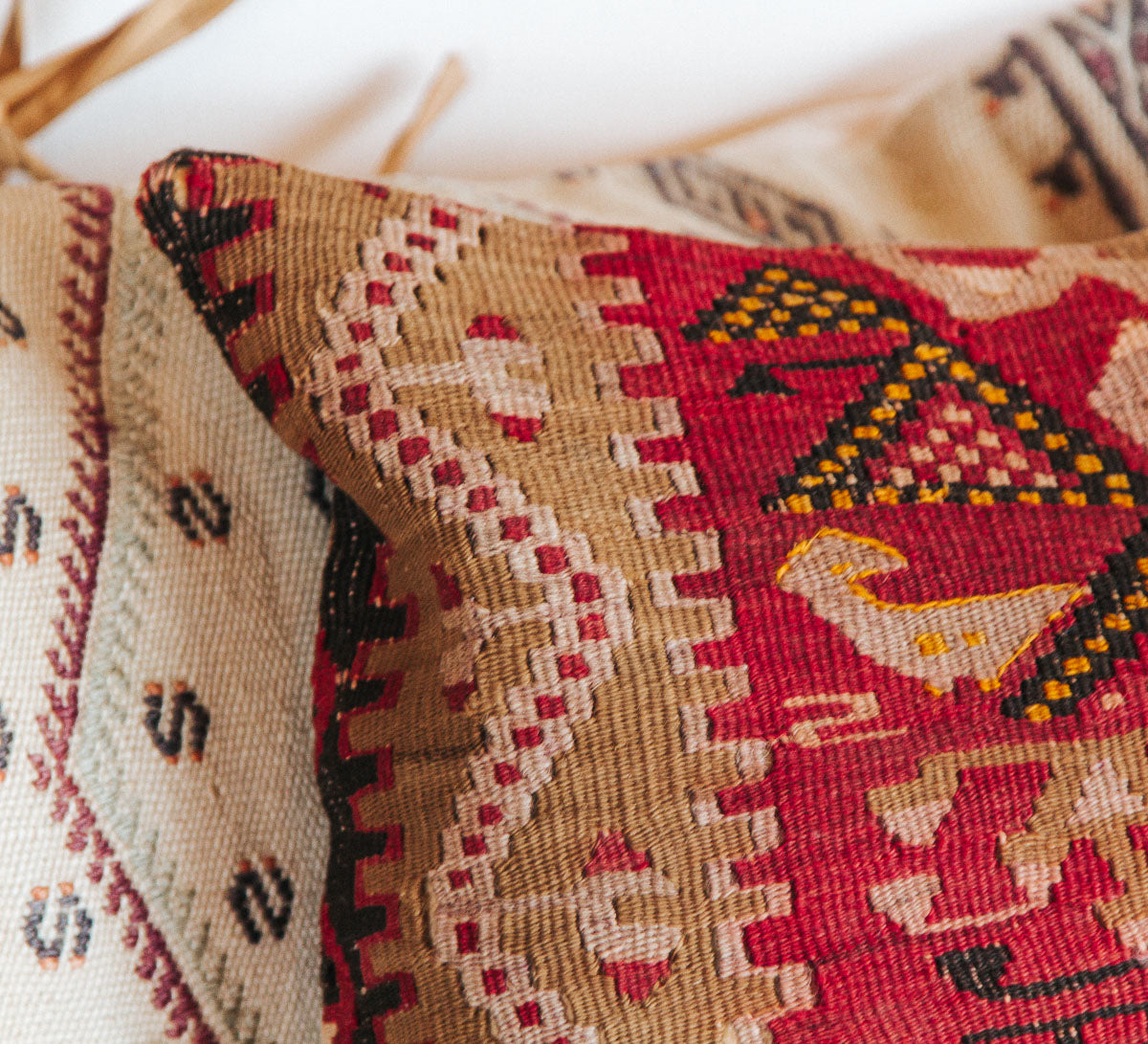 These handmade textural cushions are recycled from vintage wool Kilim rugs and turned into beautiful cushions perfect for layering.  They look amazing paired up or scattered with sheepskins for the ultimate boho vibe. Each one is unique and one of a kind.