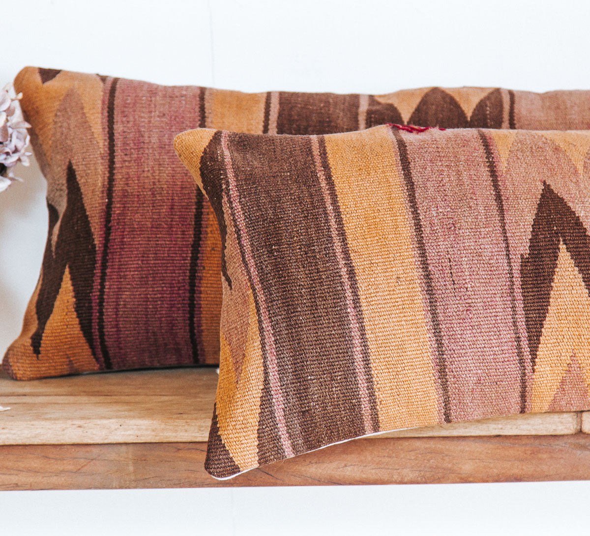 These handmade textural cushions are recycled from vintage wool Kilim rugs and turned into beautiful cushions perfect for layering.  They look amazing paired up or scattered with sheepskins for the ultimate boho vibe. Each one is unique and one of a kind. This beauty makes the perfect lumbar cushion for your couch, bed or low seating arrangement.