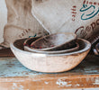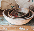 Can't get enough of that rustic handmade look?  Then you'll be love at first sight with these beauties.  Smooth carved curves and beautifully worn-in patina will add instant warmth and texture to your kitchen.  Knead your Naan bread or the perfect size for a light salad.  Prefer one in your boudoir? Put it to use holding your silver and gold treasures.