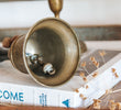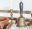 Bring back the good ol' days with this vintage brass bell! With its worn-in brass construction, wooden handle and timeless appearance, this beauty will look great on any shelf or mantle.  Or put it to use for rounding up the kiddos for dinner.  As usual, we've left the patina unpolished, but we reckon it would shine beautifully too.  Up to you!