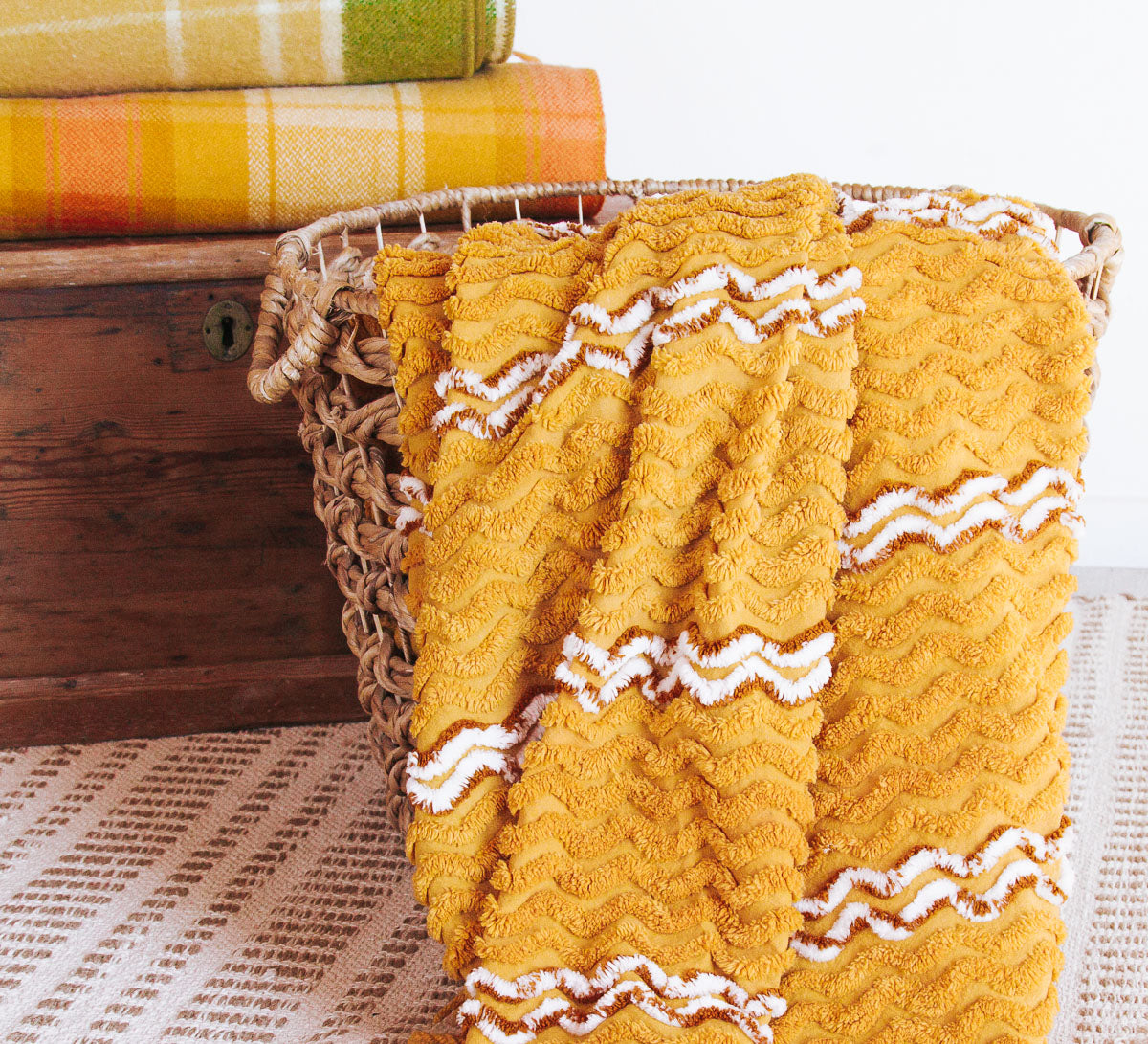 This cosy retro throw will make an awesome beach blanket - sand shakes free and the toweling texture absorbs moisture for after your summer beach swim. Who needs a towel!  Soft cotton texture, tassles and vibrant sunshine colours will also add a beautiful softness to your campervan or room.