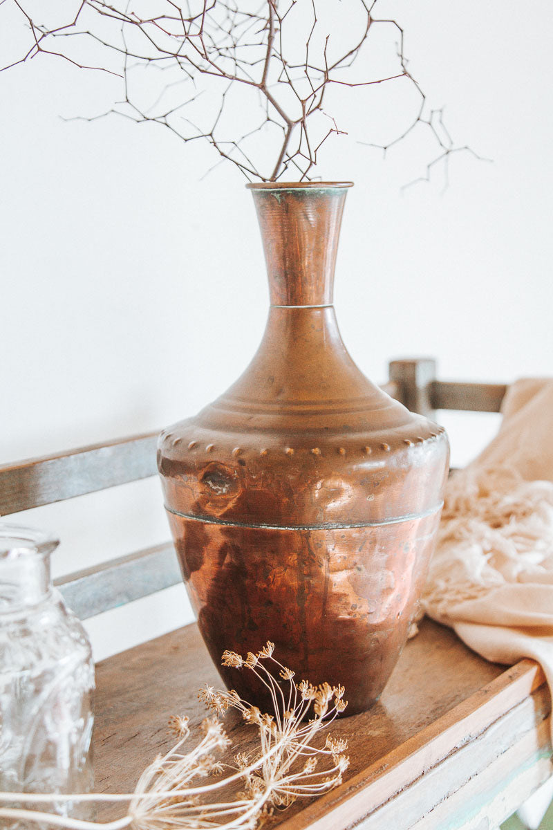 Wake up your space with this lightweight vintage copper vase! This piece is perfect for any shelfie - its exotic vibe will add some serious style to any room.  Simply pop a few of your favourite dried floral pieces in and let it shine simply. Get ready to make a statement!