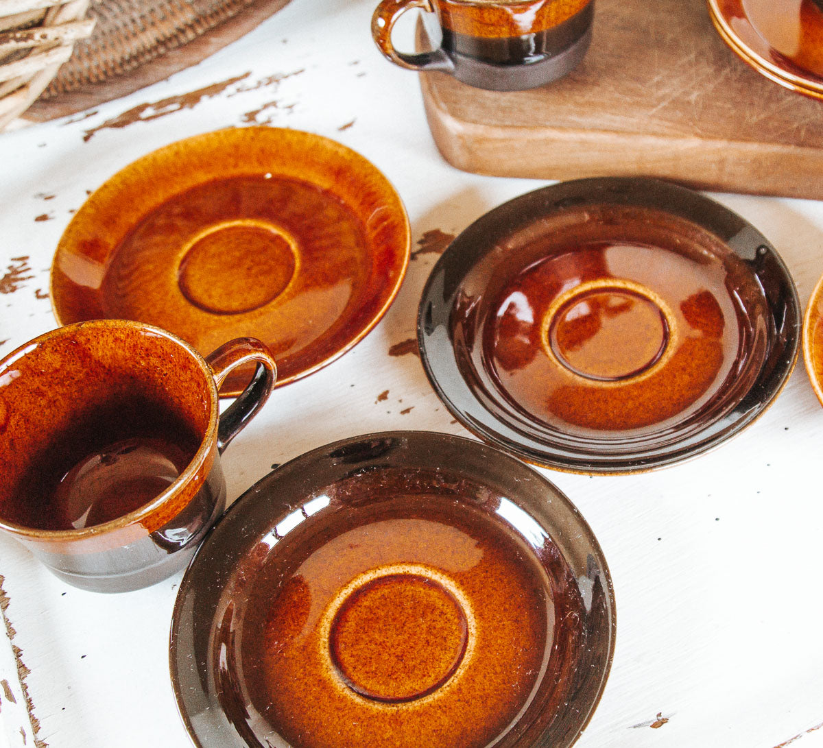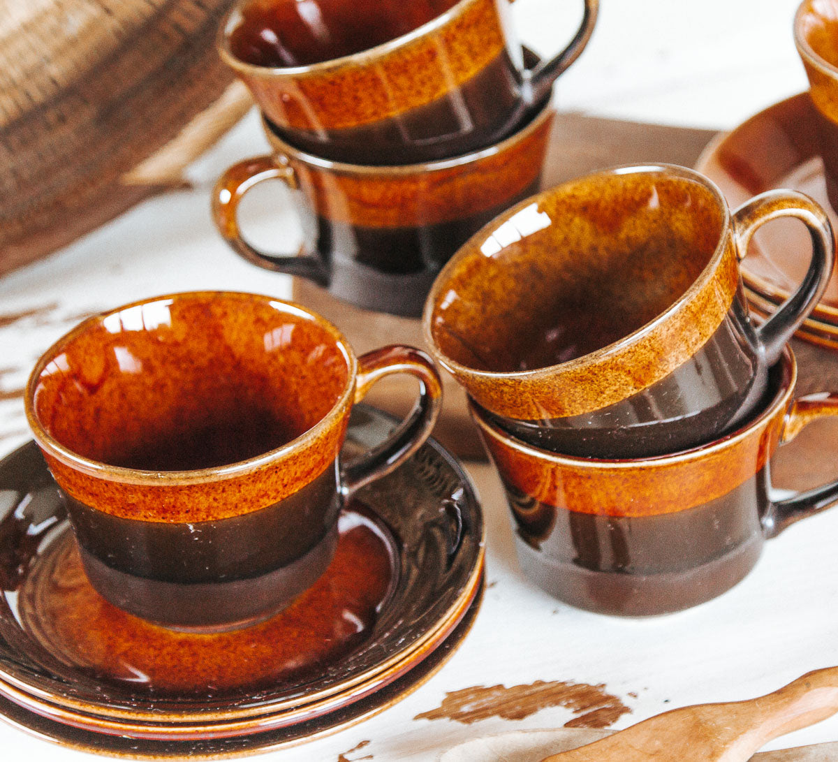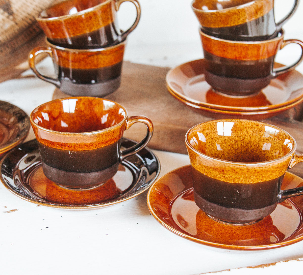A pack of gingernuts and these 1970s NZ Crown Lynn coffee cups. The perfect Saturday morning and a perfect retro vibe.  Set of 6 + saucers.  Two of the cups and saucers are a slightly different tone.