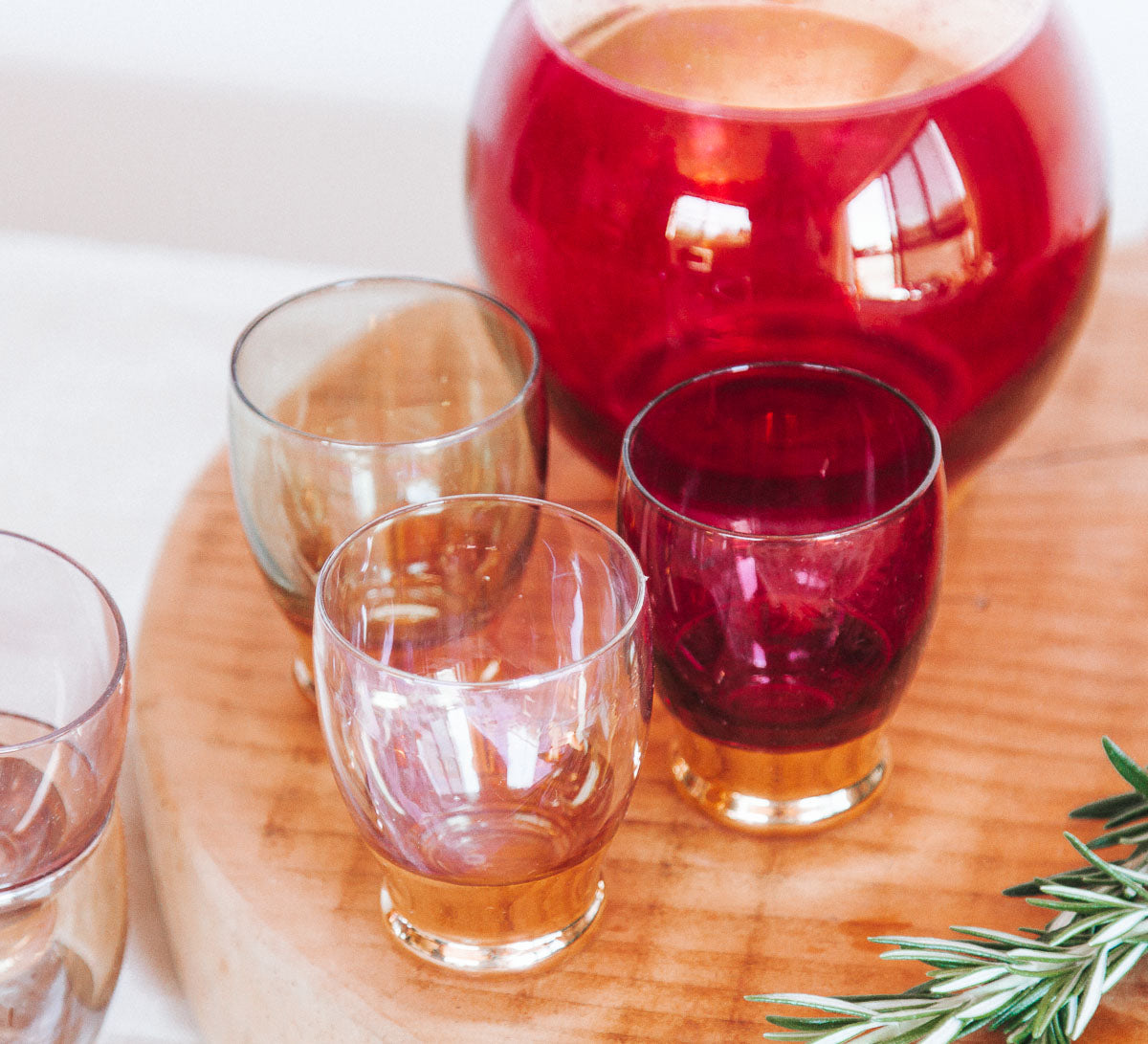 This iridescent coloured glass set is a must for every party!  Stunning, unique and the perfect boho centrepiece for serving up your favourite liqueur with the sun gently setting and James Brown on the vinyl.