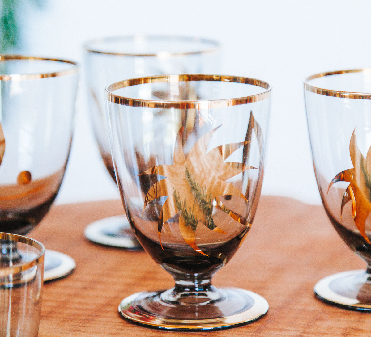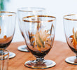 vintage boho bohemian retro smoky grey blakc liqueur glasses with gold leaf pattern