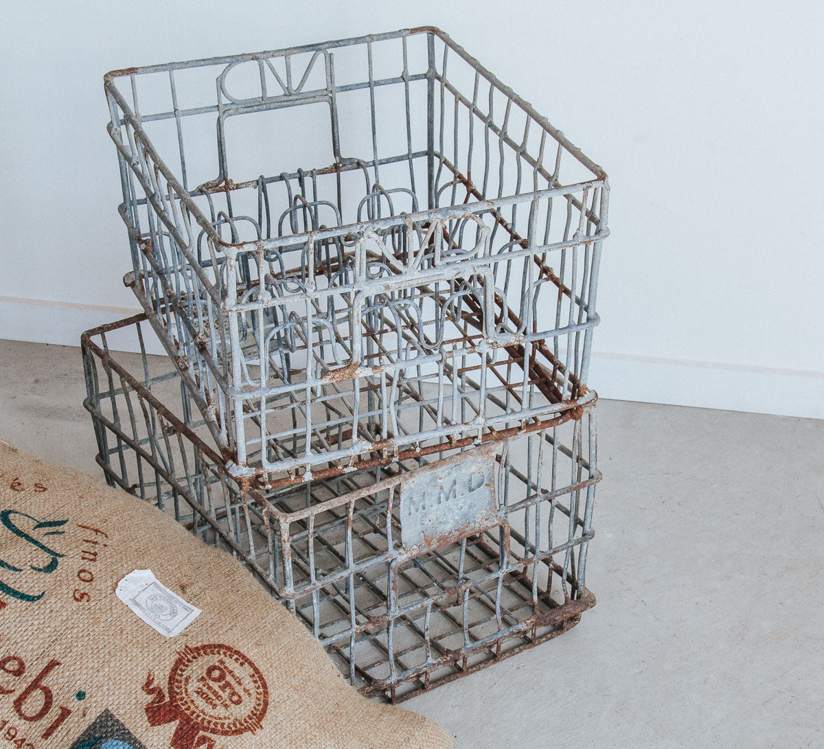 Add a dash of rustic charm with this vintage metal milk crate—perfectly worn and full of character. Flip it upside down, top it with a piece of rugged wood, and voilà: you have a quirky side table or a standout potplant stand. Its industrial, rusty look brings a playful edge to any space, blending function with vintage style effortlessly.