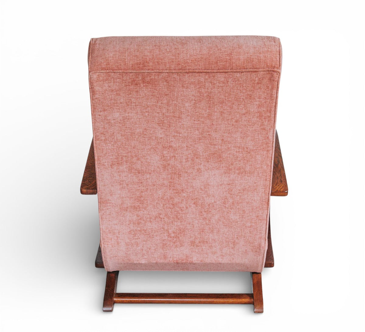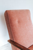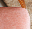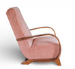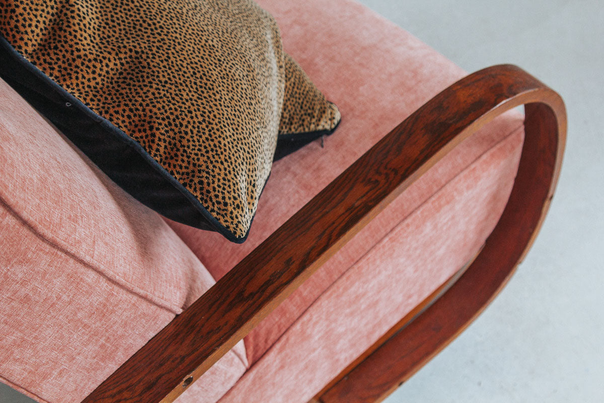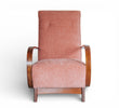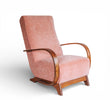 vintage boho mid century oak framed lounge chair with curved wooden arms and soft peach pink velvet seat