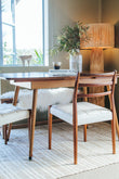 Made from mahogany, these chairs embody the classic simplicity of mid-century design while leaning into a modern, Scandi look. Upholstered in off-white, slightly textured vinyl, they’re as practical as they are stylish – perfect for pairing with anything from a rustic timber dining table to a sleek minimalist setting.