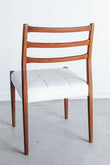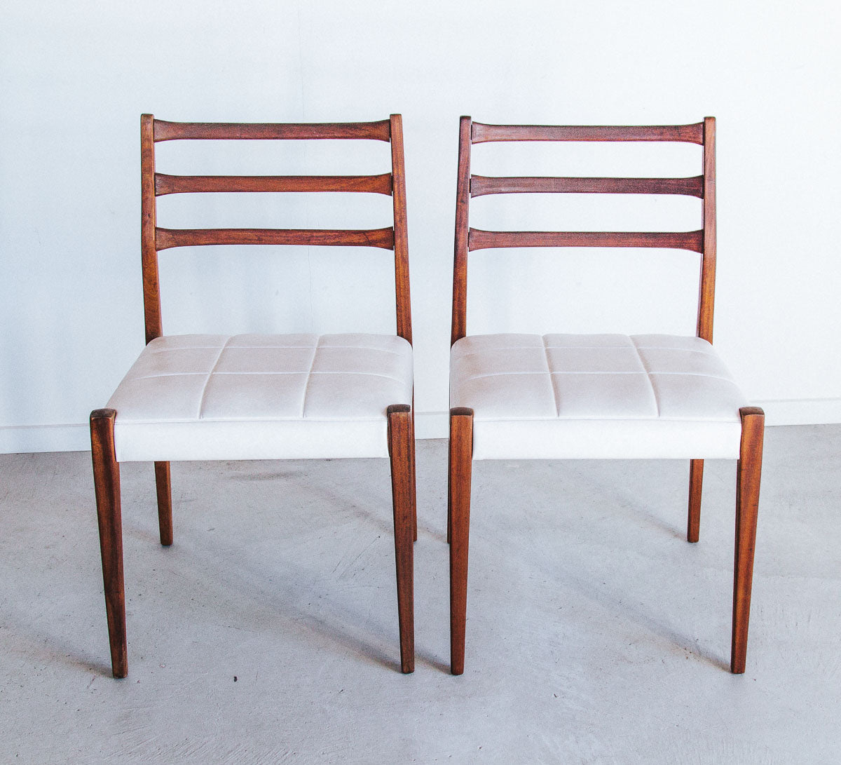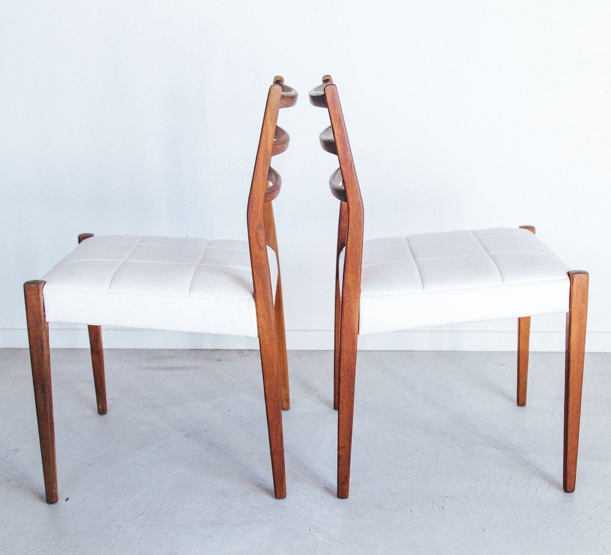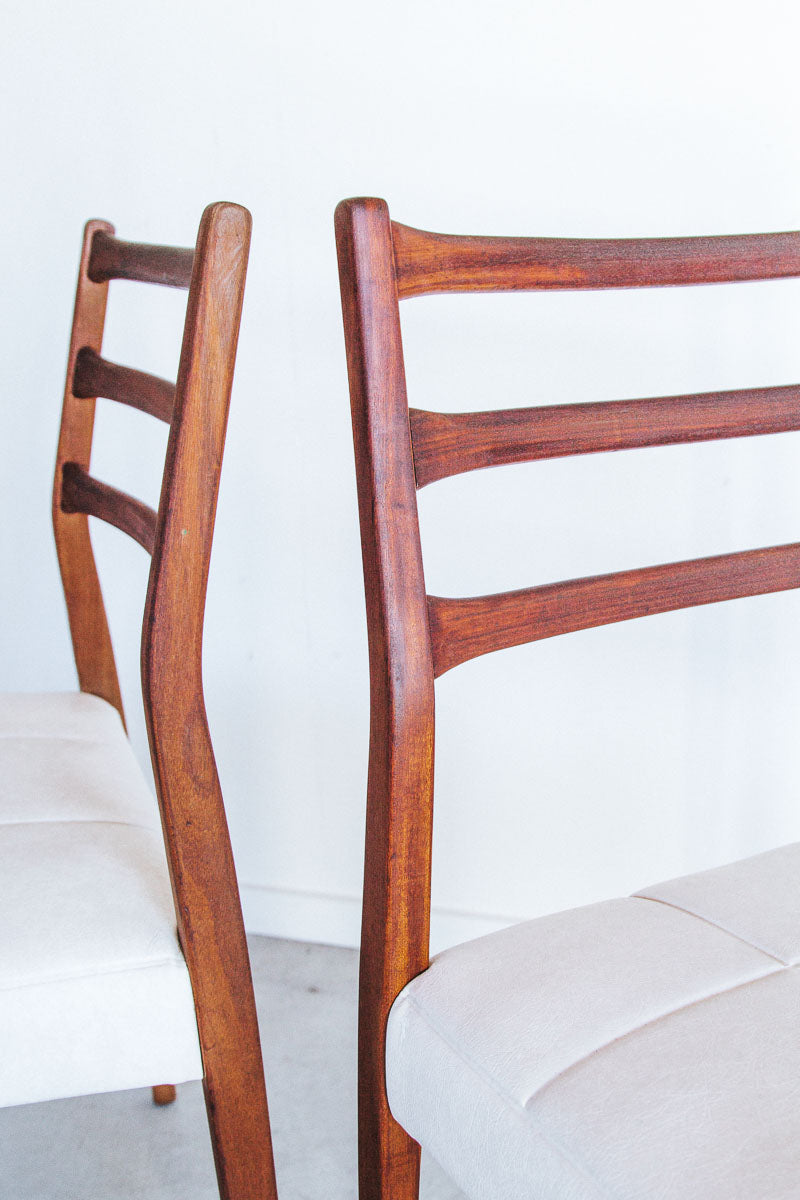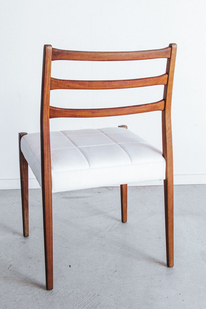 vintage mid century modern mahogany dining chairs with white textured vinyl seat